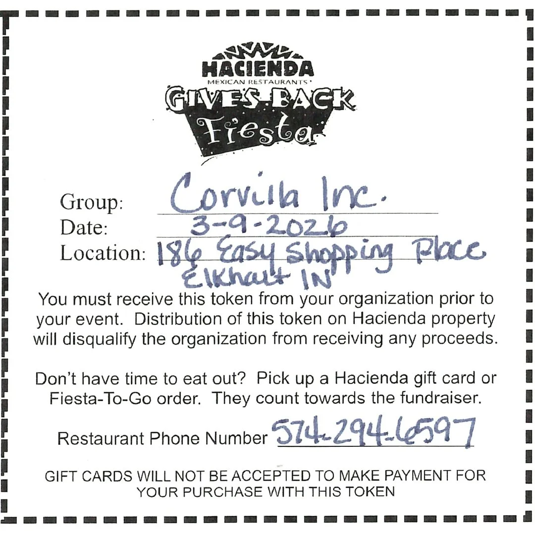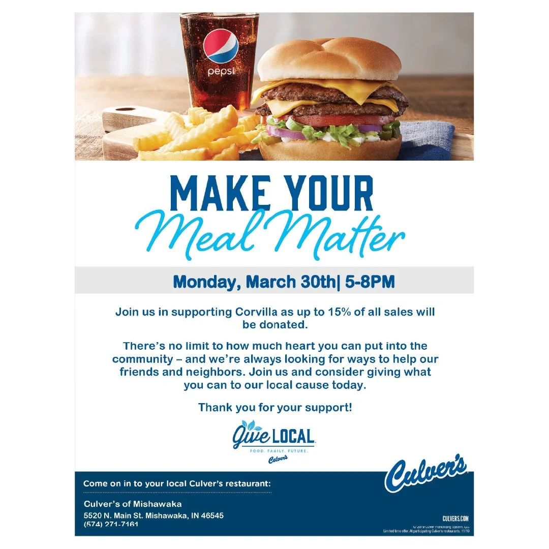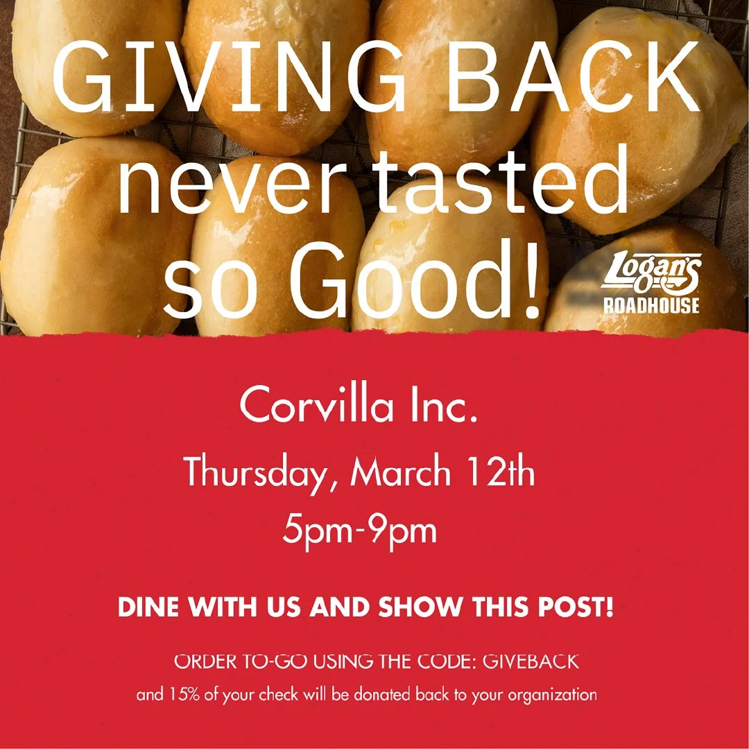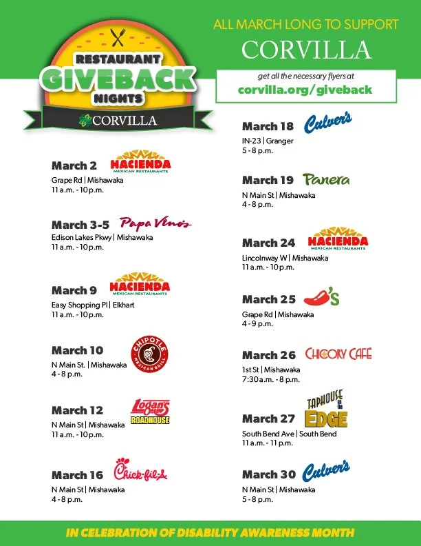 Support Corvilla all March long during Disability Awareness Month by eating at participating restaurants who will give a portion of their sales to us. From Culver’s and Chick-fil-a, to Chicory Cafe and Hacienda, and Logan’s Roadhouse or Papa Vino’s, there’s something for everyone to enjoy. Come once or once a week. Please see flyers for more information times, dates and locations.
