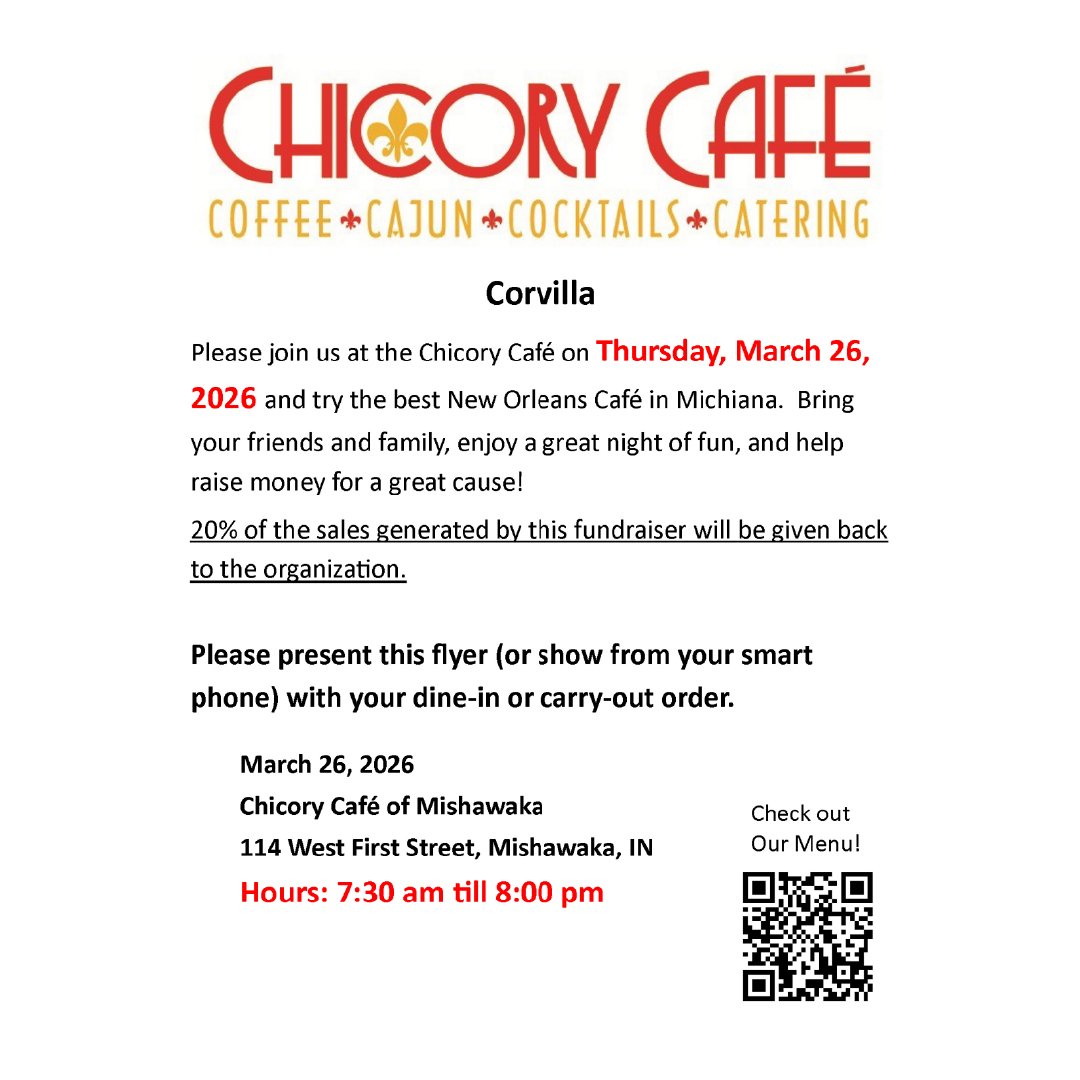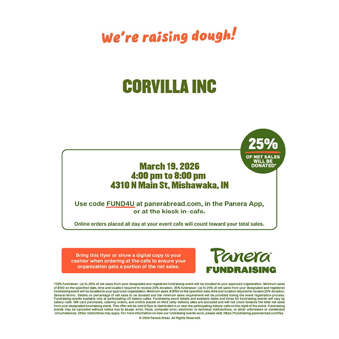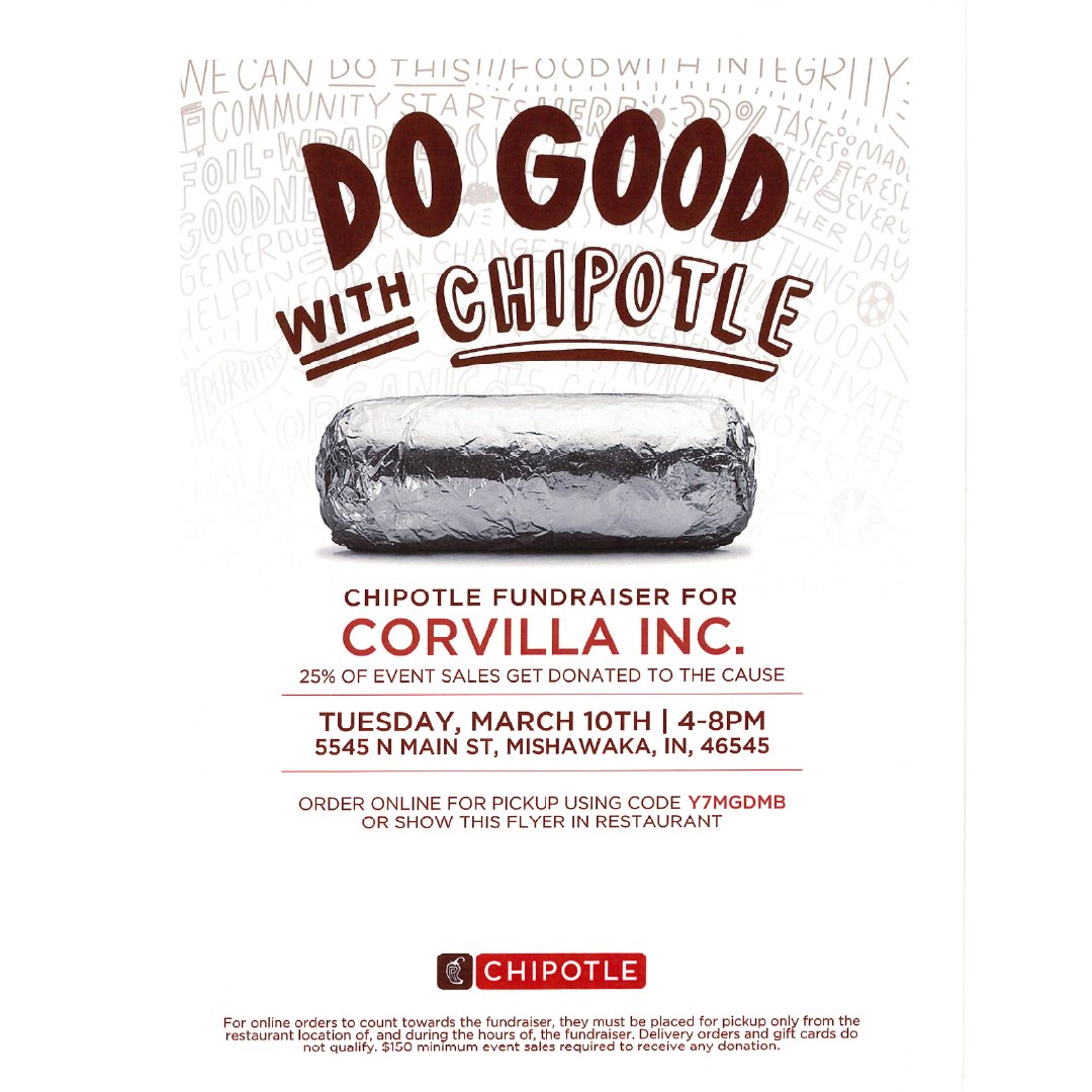 Support Corvilla all March long during Disability Awareness Month by eating at participating restaurants who will give a portion of their sales to us. From Culver’s and Chick-fil-a, to Chicory Cafe and Hacienda, and Logan’s Roadhouse or Papa Vino’s, there’s something for everyone to enjoy. Come once or once a week. Please see flyers for more information times, dates and locations.